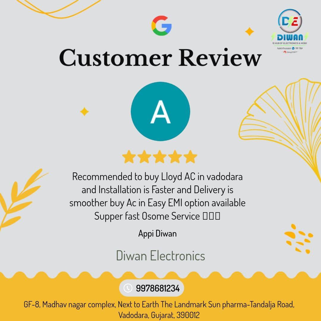 "Ramesh Gohil, a satisfied customer, loved the exceptional service at Diwan Electronics, Vadodara's leading air conditioner dealers. He experienced top-notch support while purchasing his new Lloyd AC...